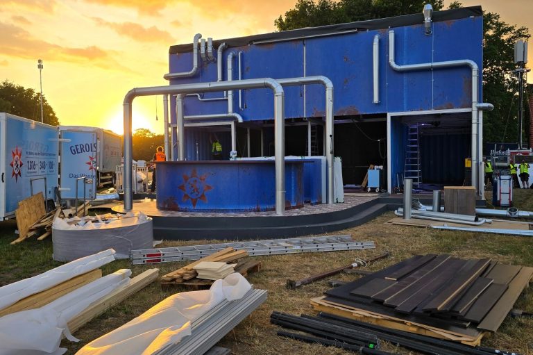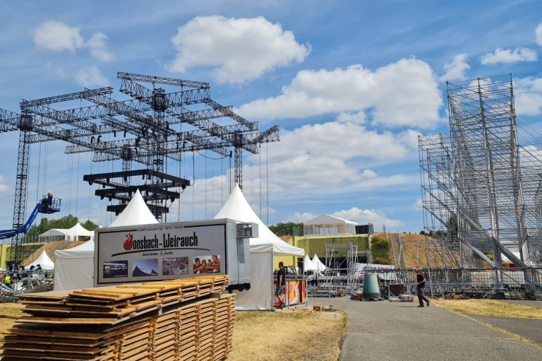 Bei dieser einizigartigen Produktion waren wir mit dem Bau der Mainstage beauftragt worden. Unter Leitung von Herrn Pauken wurden innerhalb weniger Tage das gesamte Leyergerüst und Schwarzstahlgerüst mit über 15m Höhe gestellt.